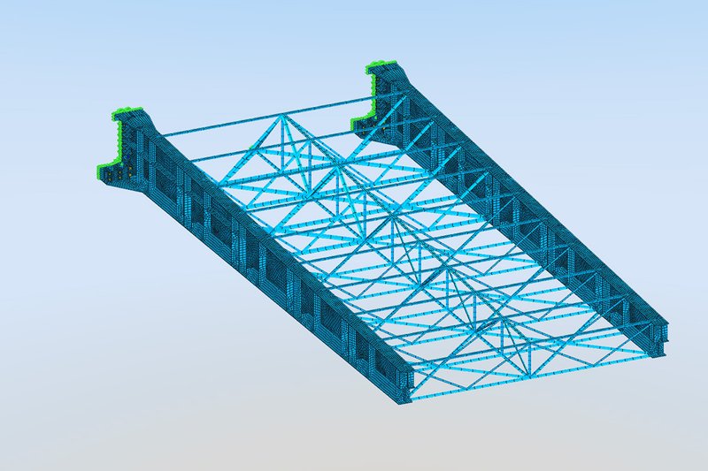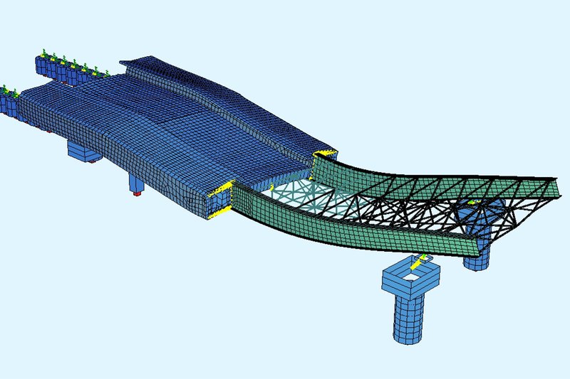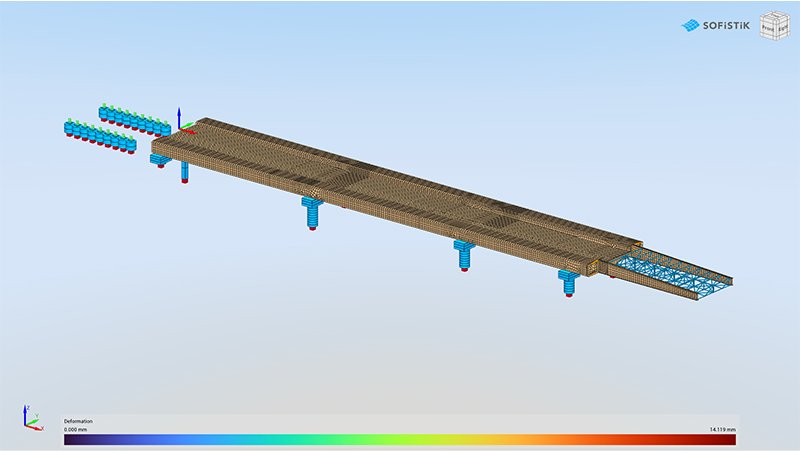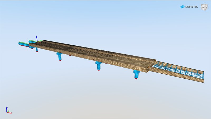 Due to the complex geometry of the superstructure and substructure, a detailed shell element analysis model was developed in SOFiSTiK for both the bridge itself and all temporary work elements to capture the transverse and torsional behavior of the structure during launching. The Construction Stage Manager functionalities for the incrementally launched bridge, as well as Design Elements for post-processing the shell element model results, were crucial for both the design and construction engineering of the bridge.