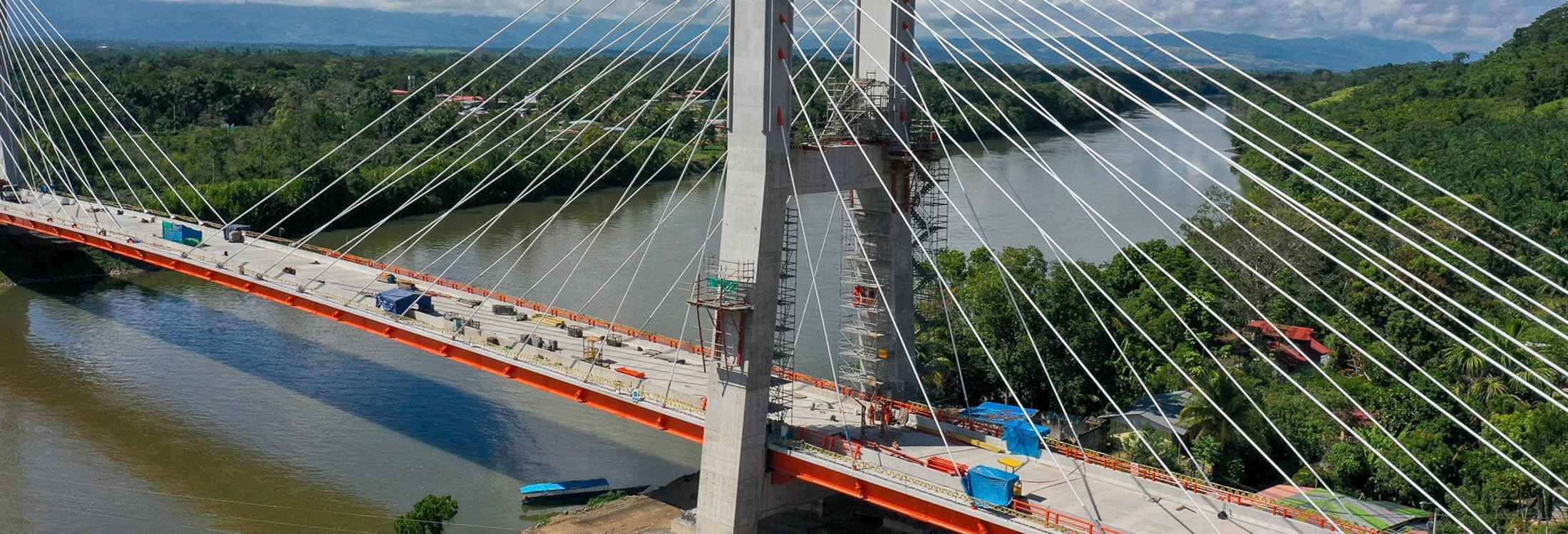 Puente Huallaga is a cable-stayed bridge designed over the river of the same name in region of San Martín, Peru. The singular structure has a composite deck section with longitudinal and transverse steel beams and a reinforced concrete top slab made of precast panels and cast-in-place stiches. The designed span distribution is 6 m + 87 m + 220.5 m + 87 m + 6 m (total length of 407.5 m). The erection process involved two types of procedures: For the side spans, temporary supports were used and, for the main span, the deck was constructed by cantilevered advance using telescopic cranes.